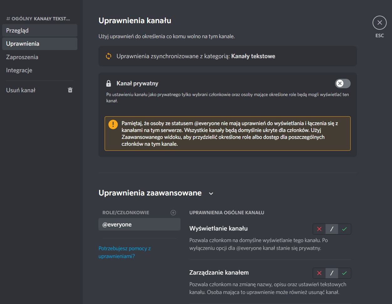 Edytując kanał możemy zobaczyć zakładkę z uprawnieniami dla każdego z nich. Tutaj możemy ustawić dla kanału jak ma się zachowywać wobec poszczególnych ról. Przykładowo, możemy tu wyłączyć widoczność kanału dla roli @everyone a następnie włączyć dla roli "zweryfikowany". Zwróć uwagę, że nieoptymalnym jest ustawiać dla kilku(nastu) kanałów ustawienia w edycji kanału dla którejś z ról, wprowadza to nieporządek, a każdą zmianę ustawień trzeba wtedy nanosić na każdy kanał z osobna. Wygodniej jest stworzyć odpowiednią rolę, a jedynie wyjątki konfigurować za pomocą ustawienia konkretnego kanału.
