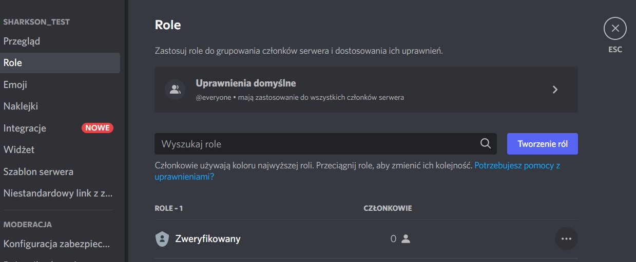 Konfiguracja poszczególnych roli odnosi się do uprawnień globalnych na serwerze w kontekście członków posiadających poszczególne role. Domyślnie każdy nowy członek serwera posiada ukrytą rolę @everyone która stanowi korzeń ról. Każda kolejna stworzona rola którą członek otrzyma nadpisuje uprawnienia definiowane w @everyone. Jeśli roli @everyone odbierzemy możliwość pisania na kanałach, stworzymy rolę "zweryfikowany" która będzie miała włączoną możliwość pisania na kanale, użytkownik z tą rolą będzie mógł wysyłać wiadomości. Ta zasada się tyczy każdego kolejnego uprawnienia.